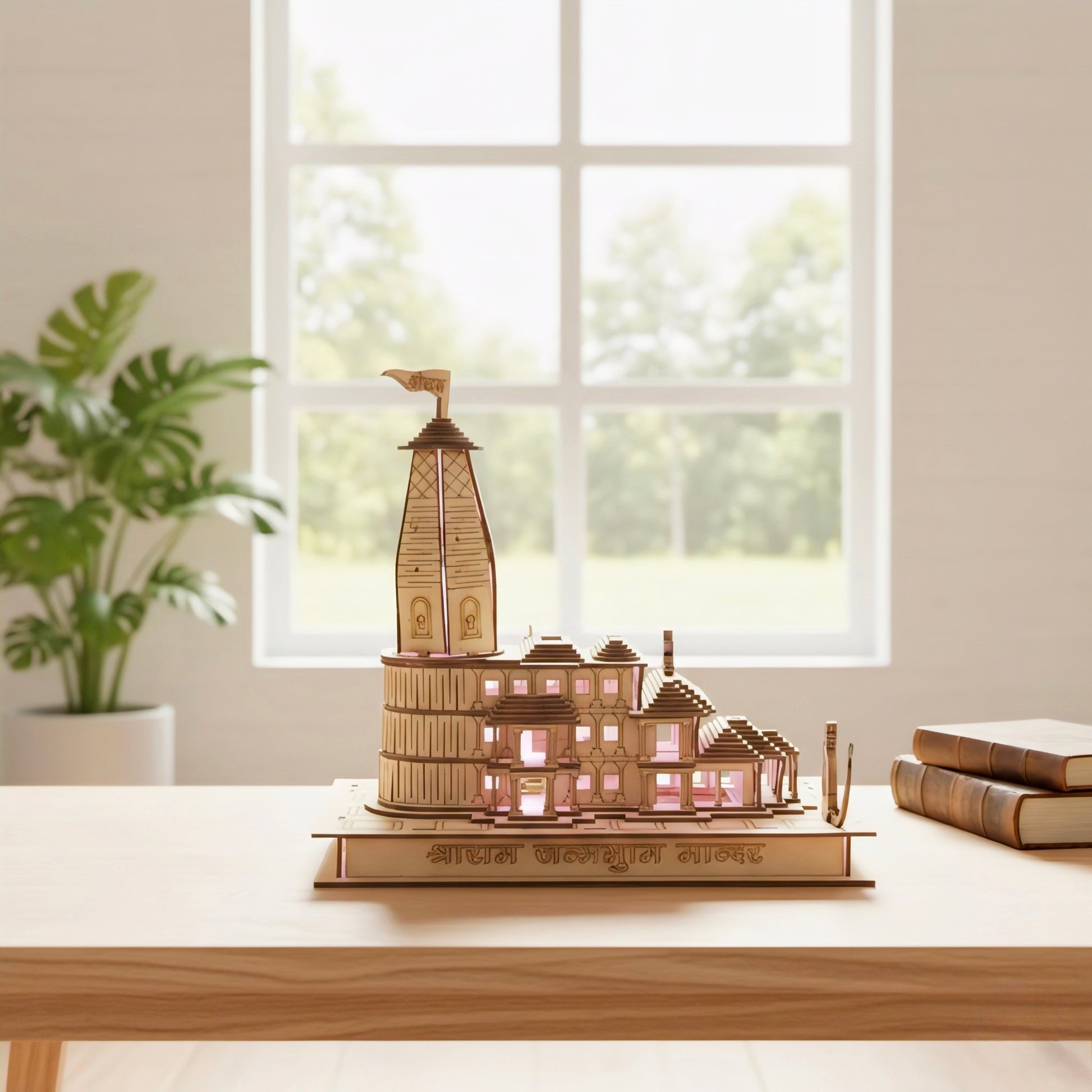 Miniature Ram Mandir (6-Inch) with LED Lights – Wooden Temple Model by VoobooToyz